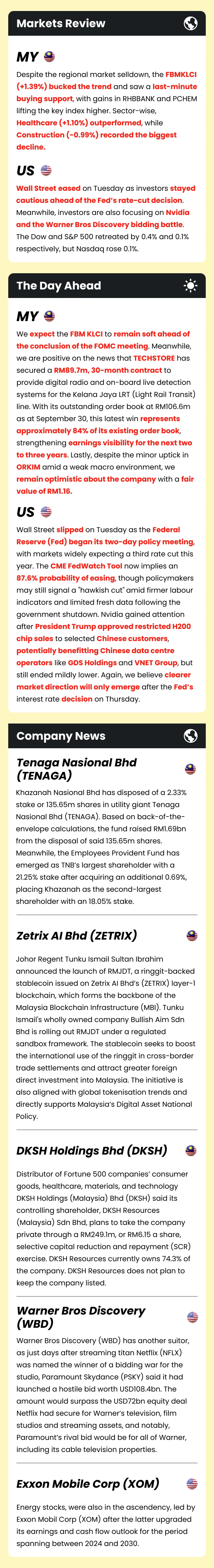 Market Morning Updates | 10 December 2025 Market Morning Updates | 10 December 2025 M+ Research December 10, 2025 1 min read Share on X/Twitter Share on Facebook Share on LinkedIn Share on Pinterest Email Copy Link On this page Stocks mentioned in this article:RHBBANK PCHEM TECHSTOREORKIM TENAGA ZETRIX DKSH NFLX WBD PSKY NVDA GDSVNET XOM