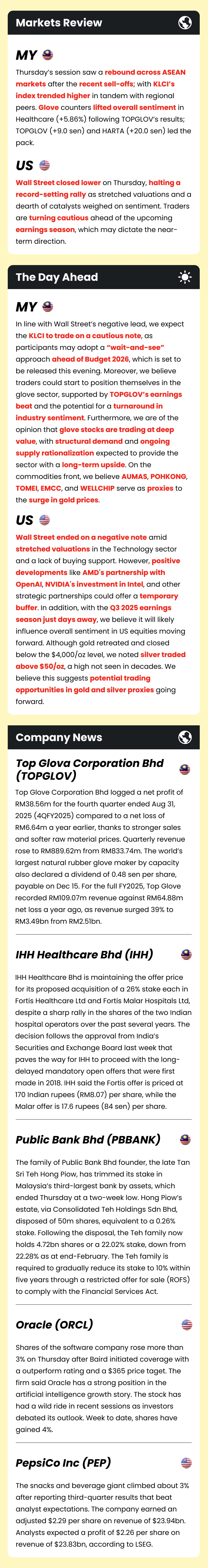Market Morning Updates | 10 October 2025 Market Morning Updates | 10 October 2025 M+ Research October 10, 2025 1 min read Share on X/Twitter Share on Facebook Share on LinkedIn Share on Pinterest Email Copy Link On this page Stocks mentioned in this article:TOPGLOV IHH PBBANK AUMAS POHKONG TOMEI EMCC WELLCHIP ORCL PEP