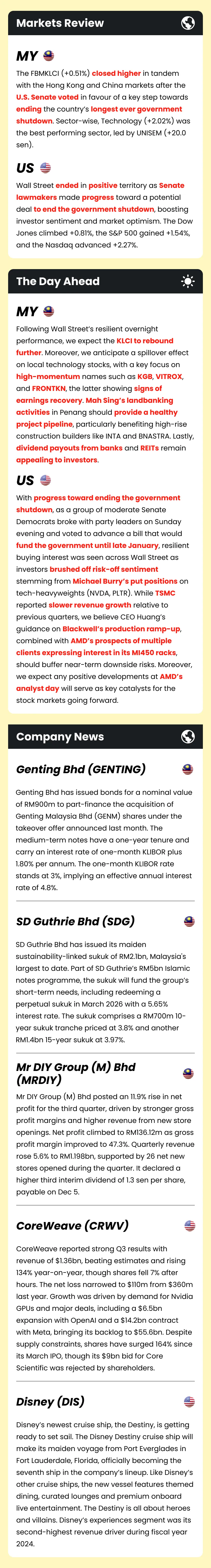 Market Morning Updates | 11 November 2025 Market Morning Updates | 11 November 2025 M+ Research November 11, 2025 1 min read Share on X/Twitter Share on Facebook Share on LinkedIn Share on Pinterest Email Copy Link On this page Stocks mentioned in this article:KGB VITROX FRONTKN MAHSING INTA BNASTRA GENTING SDG MRDIY NVDA PLTR TSMC AMD CRWV DIS