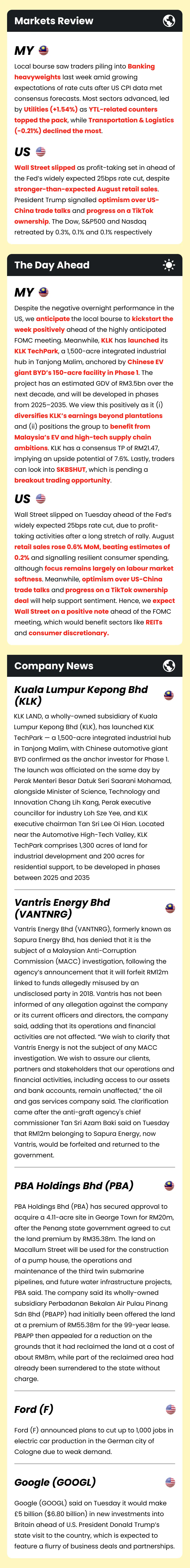 Market Morning Updates | 17 September 2025 Market Morning Updates | 17 September 2025 M+ Research September 17, 2025 1 min read Share on X/Twitter Share on Facebook Share on LinkedIn Share on Pinterest Email Copy Link On this page Stocks mentioned in this article:KLK SKBSHUTVANTNRGPBA F GOOGL