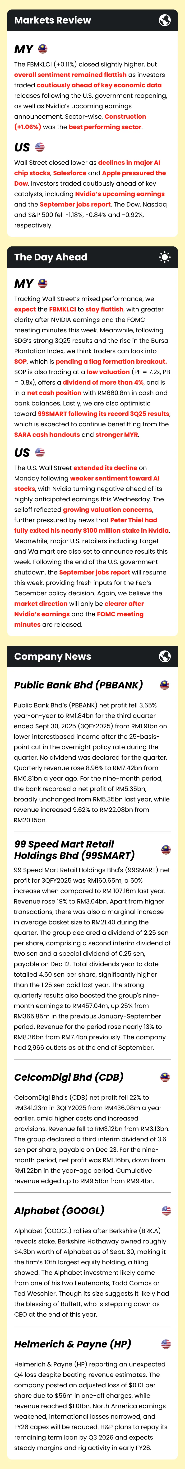 Market Morning Updates | 18 November 2025 Market Morning Updates | 18 November 2025 M+ Research November 18, 2025 1 min read Share on X/Twitter Share on Facebook Share on LinkedIn Share on Pinterest Email Copy Link On this page Stocks mentioned in this article:SDG SOP 99SMART PBBANK CDB NVDA CRM AAPL WMT TGT GOOGL HP