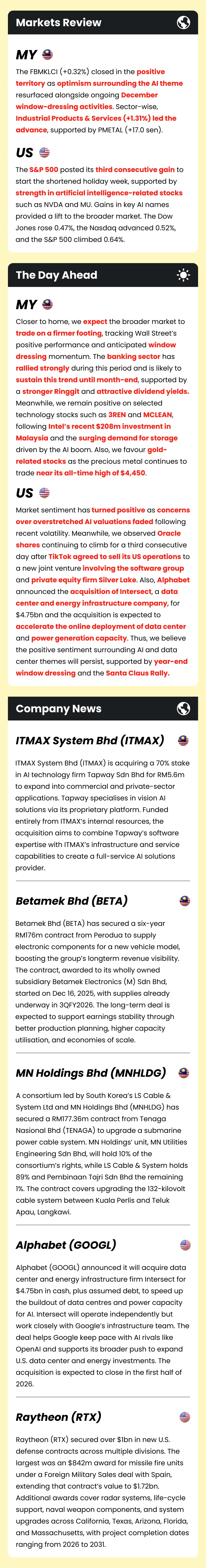 Market Morning Updates | 23 December 2025 Market Morning Updates | 23 December 2025 M+ Research December 23, 2025 1 min read Share on X/Twitter Share on Facebook Share on LinkedIn Share on Pinterest Email Copy Link On this page Stocks mentioned in this article:PMETAL 3REN MCLEAN ITMAX BETA MNHLDG NVDA MU INTL ORCL GOOGL RTX
