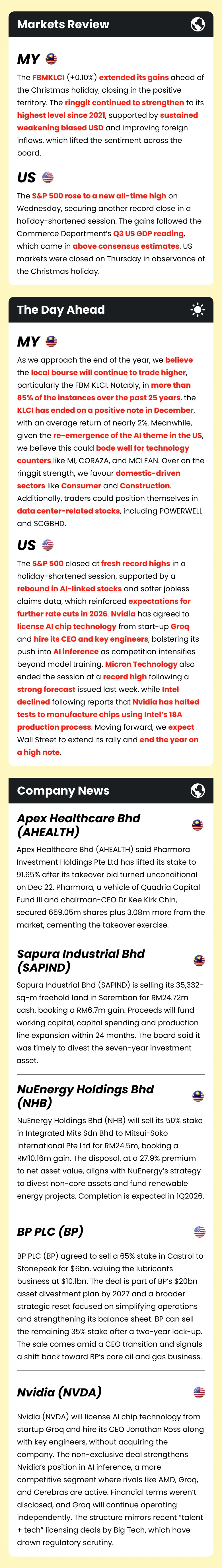 Market Morning Updates | 26 December 2025 Market Morning Updates | 26 December 2025 M+ Research December 26, 2025 1 min read Share on X/Twitter Share on Facebook Share on LinkedIn Share on Pinterest Email Copy Link On this page Stocks mentioned in this article:MI CORAZA MCLEAN PWRWELL SCGBHD AHEALTH SAPIND NHB NVDA MU INTC BP