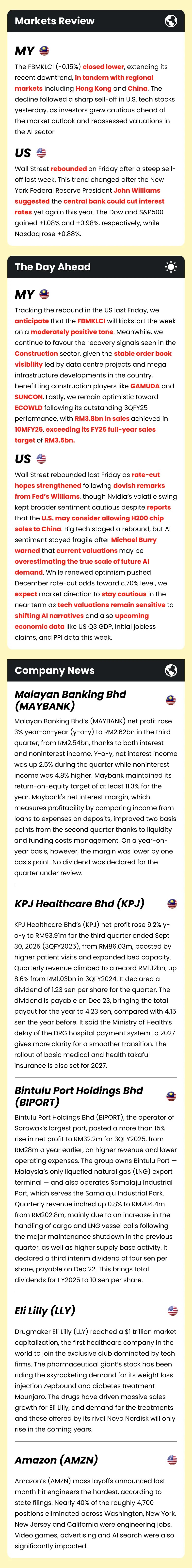 Market Morning Updates | 24 November 2025 Market Morning Updates | 24 November 2025 M+ Research November 24, 2025 1 min read Share on X/Twitter Share on Facebook Share on LinkedIn Share on Pinterest Email Copy Link On this page Stocks mentioned in this article:GAMUDA SUNCON ECOWLD MAYBANK KPJ BIPORT NVDA LLY AMZN