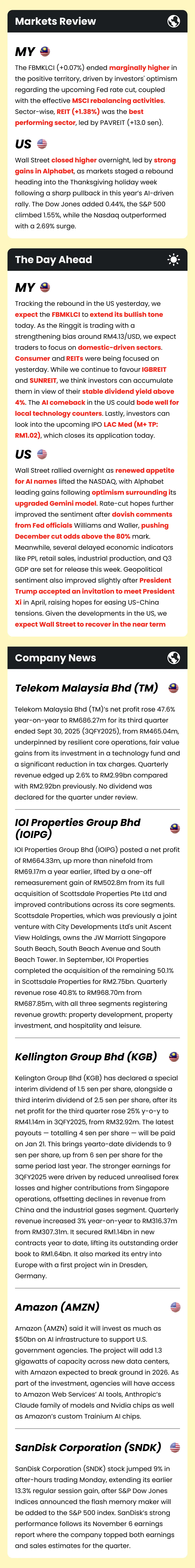 Market Morning Updates | 25 November 2025 Market Morning Updates | 25 November 2025 M+ Research November 25, 2025 1 min read Share on X/Twitter Share on Facebook Share on LinkedIn Share on Pinterest Email Copy Link On this page Stocks mentioned in this article:PAVREIT IGBREIT SUNREIT LACMEDTM IOIPG KGB GOOG AMZN SNDK