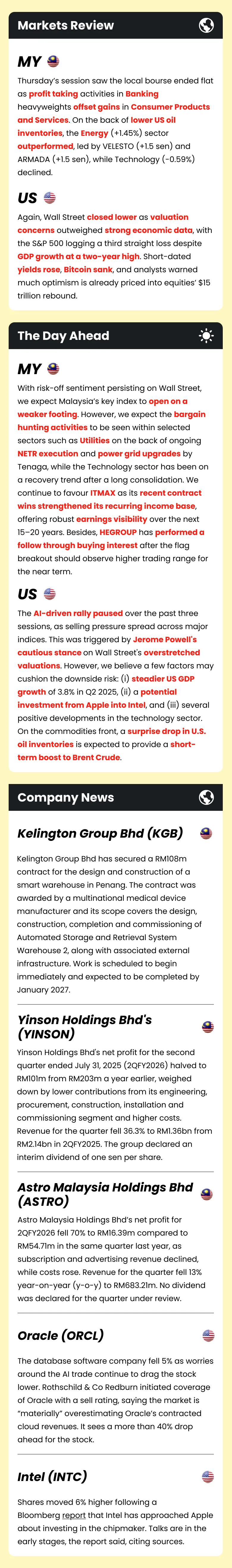Market Morning Updates | 26 September 2025 Market Morning Updates | 26 September 2025 M+ Research September 26, 2025 1 min read Share on X/Twitter Share on Facebook Share on LinkedIn Share on Pinterest Email Copy Link On this page Stocks mentioned in this article:ITMAX HEGROUP KGB YINSON ASTROINTC ORCL