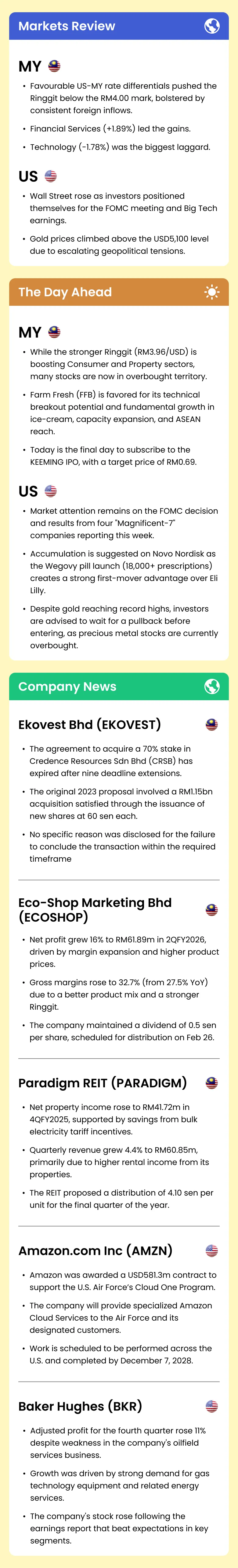 Market Morning Updates | 27 January 2026 Market Morning Updates | 27 January 2026 M+ Research January 27, 2026 1 min read Share on X/Twitter Share on Facebook Share on LinkedIn Share on Pinterest Email Copy Link On this page Stocks mentioned in this article:FFB EKOVESTECOSHOP PARADIGM KEEMING NVO LLY AMZN BKR