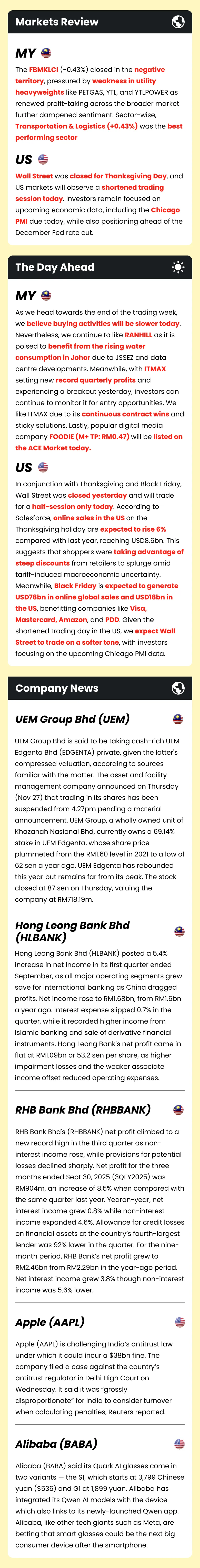 Market Morning Updates | 28 November 2025 Market Morning Updates | 28 November 2025 M+ Research November 28, 2025 1 min read Share on X/Twitter Share on Facebook Share on LinkedIn Share on Pinterest Email Copy Link On this page Stocks mentioned in this article:PETGAS YTL YTLPOWR RANHILL ITMAX FOODIEEDGENTA HLBANK RHBBANK V MA NVDA PDD AAPL BABA