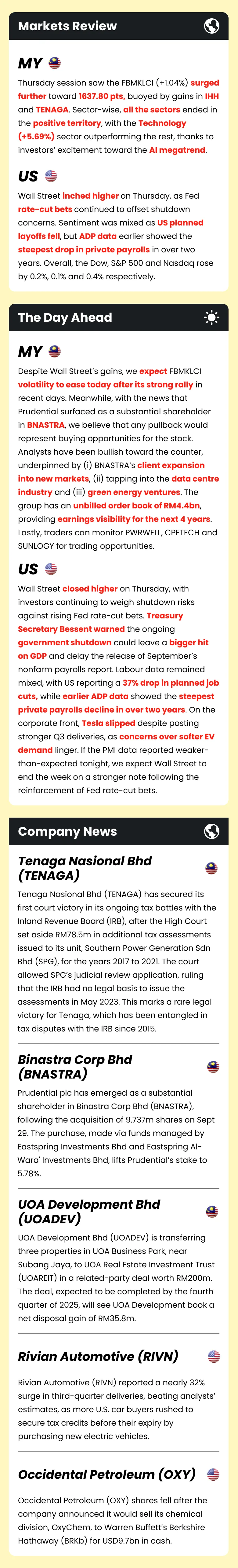 Market Morning Updates | 3 October 2025 Market Morning Updates | 3 October 2025 M+ Research October 03, 2025 1 min read Share on X/Twitter Share on Facebook Share on LinkedIn Share on Pinterest Email Copy Link On this page Stocks mentioned in this article:IHH TENAGA BNASTRA PWRWELL CPETECH SUNLOGY TENAGA UOADEV TSLA RIVN OXY