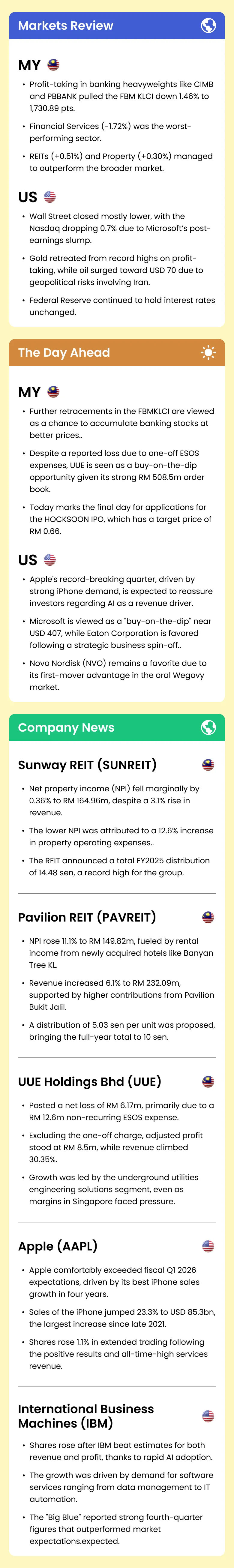 Market Morning Updates | 30 January 2026 Market Morning Updates | 30 January 2026 M+ Research January 30, 2026 1 min read Share on X/Twitter Share on Facebook Share on LinkedIn Share on Pinterest Email Copy Link On this page Stocks mentioned in this article:CIMB PBBANK UUE HOCKSOON SUNREIT PAVREIT MSFT NVO AAPL IBM