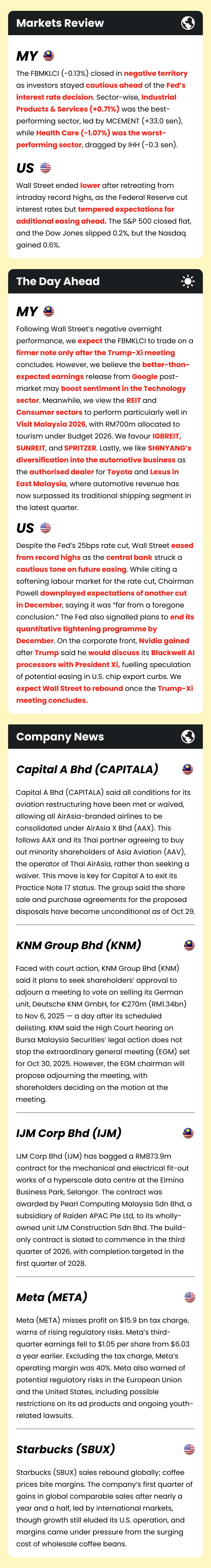 Market Morning Updates | 30 October 2025 Market Morning Updates | 30 October 2025 M+ Research October 30, 2025 1 min read Share on X/Twitter Share on Facebook Share on LinkedIn Share on Pinterest Email Copy Link On this page Stocks mentioned in this article:MCEMENT IHH IGBREIT SUNREIT SPRITZER SYGROUP CAPITALA KNM IJM NVDA META SBUX