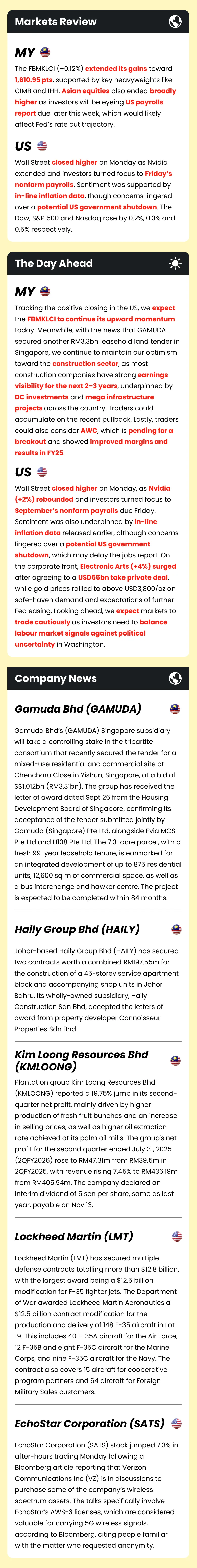 Market Morning Updates | 30 September 2025 Market Morning Updates | 30 September 2025 M+ Research September 30, 2025 1 min read Share on X/Twitter Share on Facebook Share on LinkedIn Share on Pinterest Email Copy Link On this page Stocks mentioned in this article:CIMB IHH GAMUDA AWC HAILY KMLOONG NVDA EA LMT SATS
