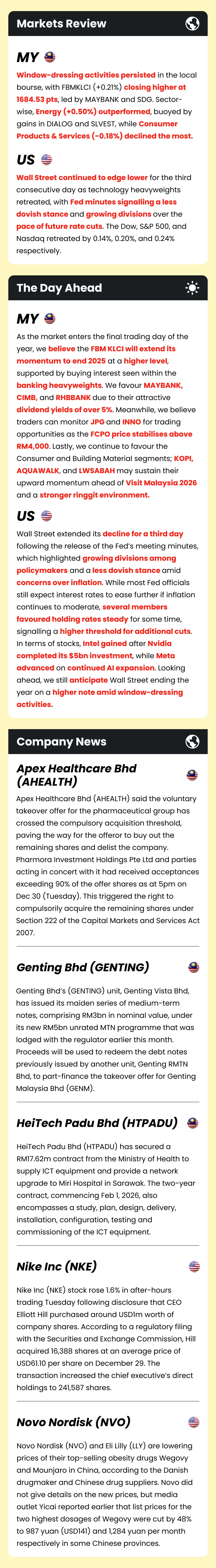 Market Morning Updates | 31 December 2025 Market Morning Updates | 31 December 2025 M+ Research December 31, 2025 1 min read Share on X/Twitter Share on Facebook Share on LinkedIn Share on Pinterest Email Copy Link On this page Stocks mentioned in this article:MAYBANK SDG DIALOG SLVESTCIMB RHBBANK JPG INNOKOPI AQUAWALK LWSABAH AHEALTH GENTING HTPADU NVDA INTL META NKE NVO LLY