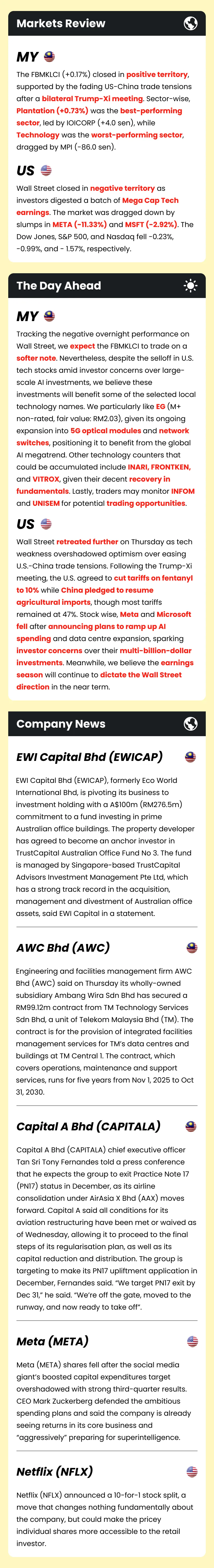 Market Morning Updates | 31 October 2025 Market Morning Updates | 31 October 2025 M+ Research October 31, 2025 1 min read Share on X/Twitter Share on Facebook Share on LinkedIn Share on Pinterest Email Copy Link On this page Stocks mentioned in this article:IOICORP MPI EG INARI FRONTKN INFOM UNISEM EWICAP AWC CAPITALA KNM IJM META MSFT NFLX