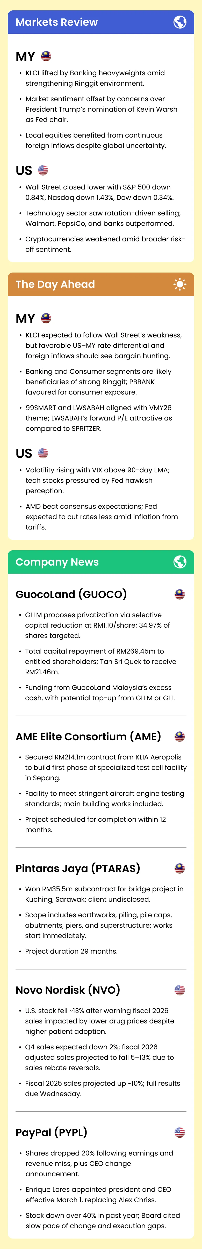 Market Morning Updates | 4 February 2026 Market Morning Updates | 4 February 2026 M+ Research February 04, 2026 1 min read Share on X/Twitter Share on Facebook Share on LinkedIn Share on Pinterest Email Copy Link On this page Stocks mentioned in this article:PBBANK 99SMART LWSABAH GUOCO AME PTARAS NVO PYPL