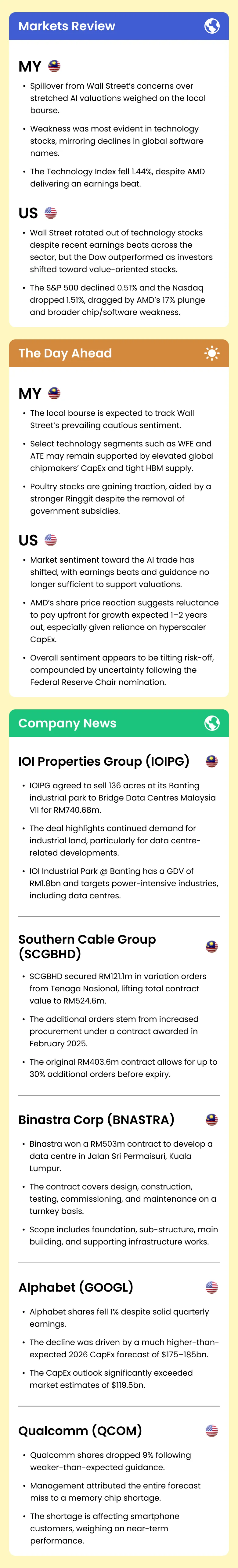 Market Morning Updates | 5 February 2026 Market Morning Updates | 5 February 2026 M+ Research February 05, 2026 1 min read Share on X/Twitter Share on Facebook Share on LinkedIn Share on Pinterest Email Copy Link On this page Stocks mentioned in this article:IOIPG SCGBHD TENAGA BNASTRA AMD GOOGL QCOM