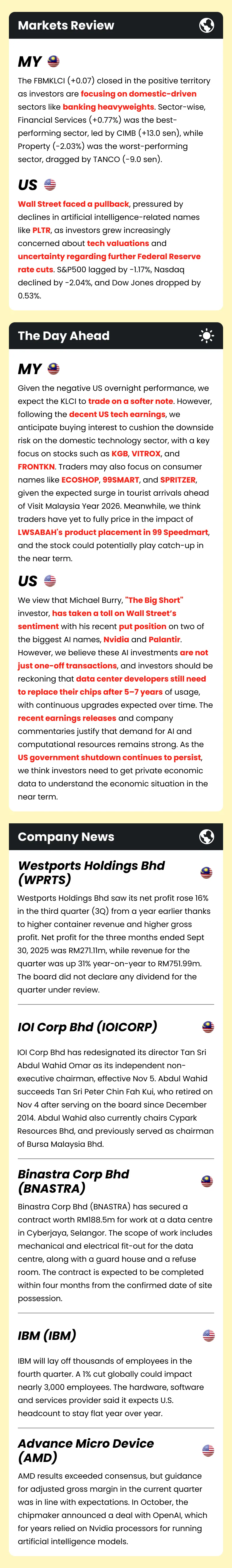 Market Morning Updates | 5 November 2025 Market Morning Updates | 5 November 2025 M+ Research November 05, 2025 1 min read Share on X/Twitter Share on Facebook Share on LinkedIn Share on Pinterest Email Copy Link On this page Stocks mentioned in this article:KGB VITROX FRONTKN 99SMART SPRITZER LWSABAH IOICORP $.US: IBM AMD