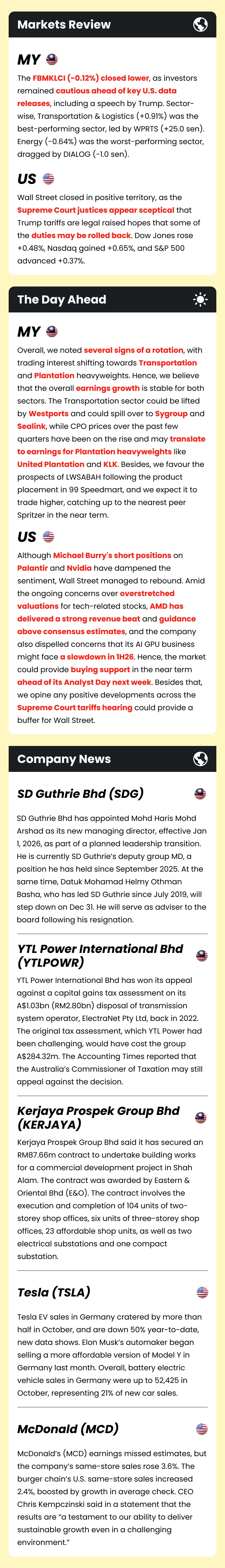 Market Morning Updates | 6 November 2025 Market Morning Updates | 6 November 2025 M+ Research November 06, 2025 1 min read Share on X/Twitter Share on Facebook Share on LinkedIn Share on Pinterest Email Copy Link On this page Stocks mentioned in this article:UTDPLTKLKLWSABAHSDGYTLPOWRKERJAYA PLTR NVDA TSLA MCD