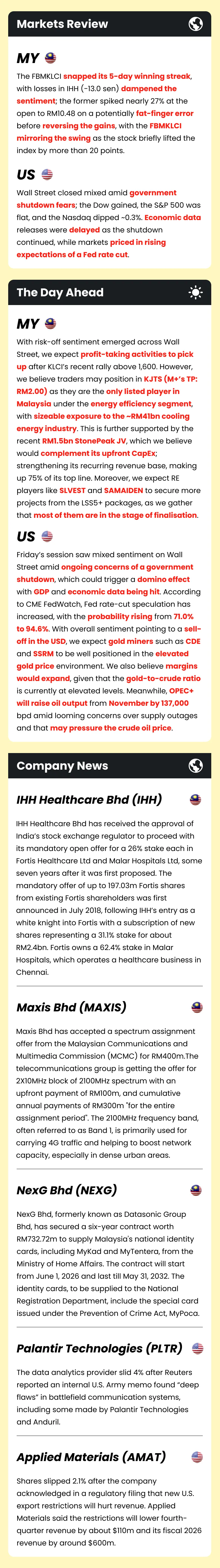 Market Morning Updates | 6 October 2025 Market Morning Updates | 6 October 2025 M+ Research October 06, 2025 1 min read Share on X/Twitter Share on Facebook Share on LinkedIn Share on Pinterest Email Copy Link On this page Stocks mentioned in this article:KJTS SLVEST SAMAIDEN IHH MAXIS DSONIC PLTR AMAT CDE SSRM