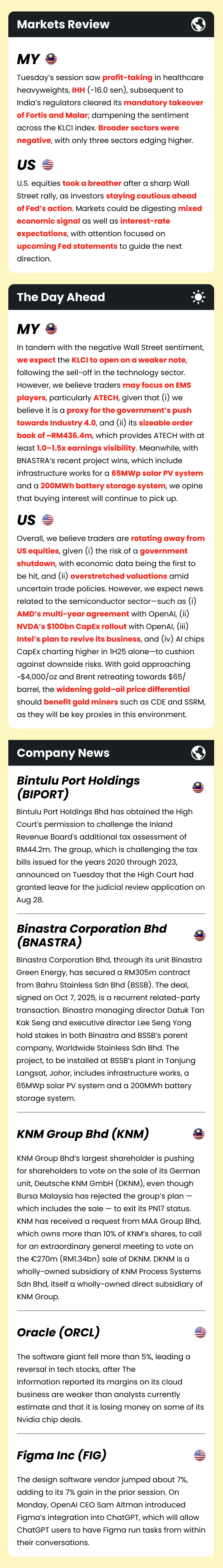 Market Morning Updates | 8 October 2025 Market Morning Updates | 8 October 2025 M+ Research October 08, 2025 1 min read Share on X/Twitter Share on Facebook Share on LinkedIn Share on Pinterest Email Copy Link On this page Stocks mentioned in this article:BIPORT BNASTRA KNM ORCL FIGMA