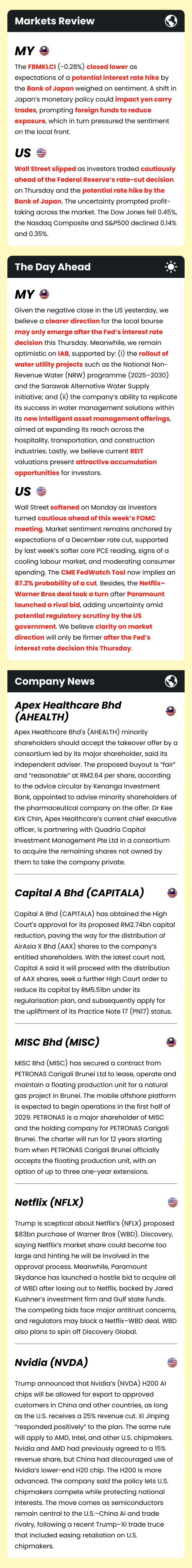 Market Morning Updates | 9 December 2025 Market Morning Updates | 9 December 2025 M+ Research December 09, 2025 1 min read Share on X/Twitter Share on Facebook Share on LinkedIn Share on Pinterest Email Copy Link On this page Stocks mentioned in this article:IABAHEALTH CAPITALA MISC NFLX WBD NVDA AMD INTC
