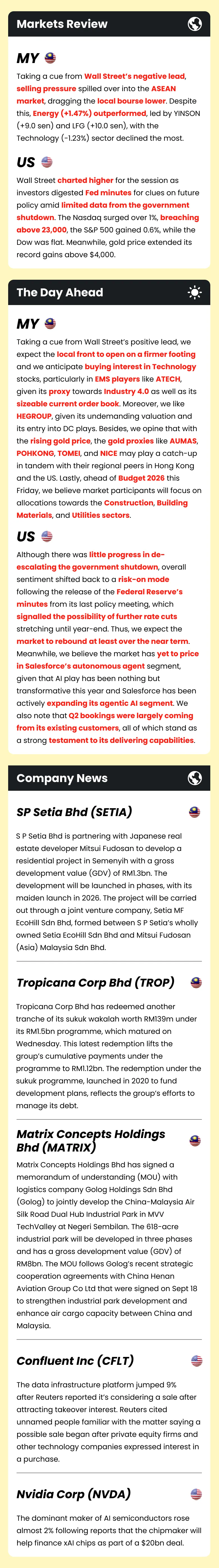 Market Morning Updates | 9 October 2025 Market Morning Updates | 9 October 2025 M+ Research October 09, 2025 1 min read Share on X/Twitter Share on Facebook Share on LinkedIn Share on Pinterest Email Copy Link On this page Stocks mentioned in this article:SPSETIA TROP MATRIX AUMAS POHKONG TOMEI NICE HEGROUP CFLT NVDA CRM
