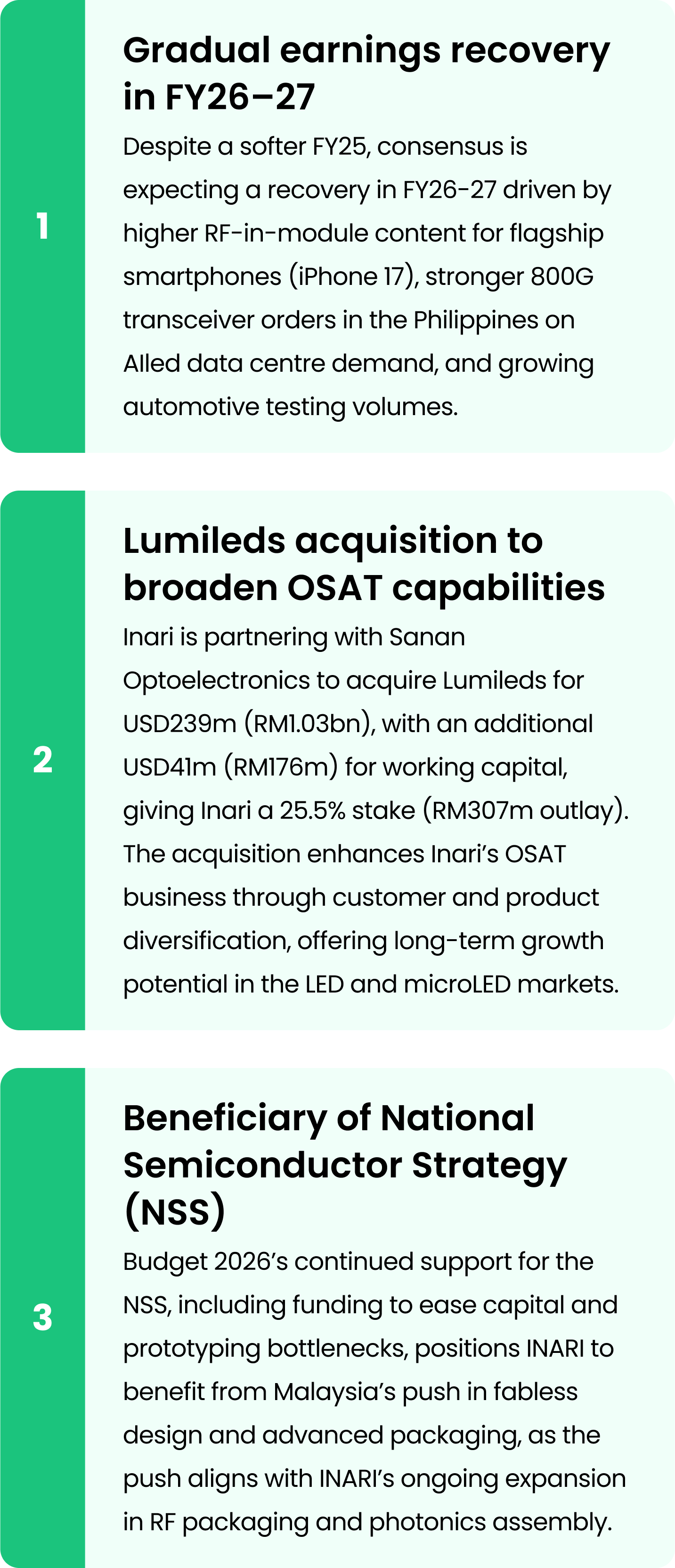 INARI is an outsourced semiconductor assembly and test (OSAT) service provider for radio frequency, fiber-optics transceivers, opto-electronics, sensors, and custom integrated circuit (IC) technologies. Its activities include wafer processing, chip fabrication and wafer certification in fiber optic chips, system in package assembly and test, and other services