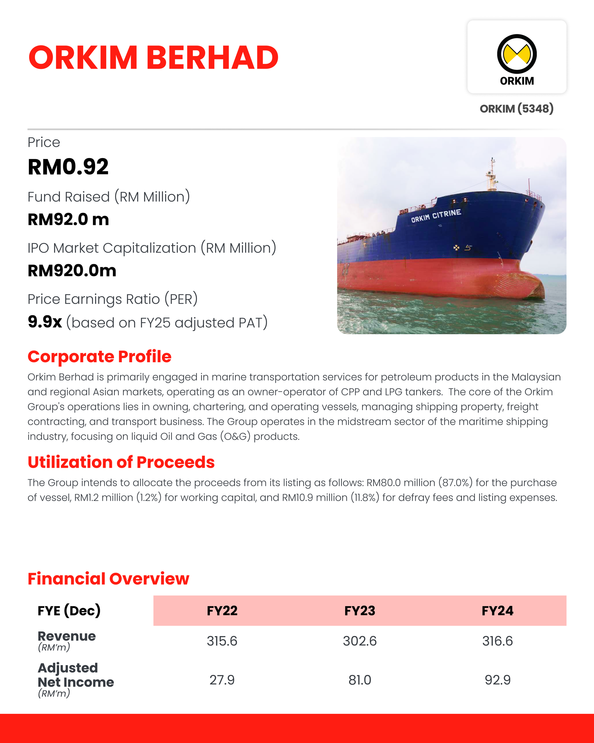A significant focus is placed on a fleet modernization program to align with evolving ESG standards and enhance operational efficiency. This plan involves Orkim Berhad setting aside at least RM50m, which will be funded through a combination of internally generated funds and borrowings, within 24 months from listing for extensive upgrades during mandatory dry dockings. Key initiatives include propulsion system enhancements such as installing energy-saving devices like Propeller Boss Cap Fins (PBCF) and engine overhauls to reduce fuel consumption and emissions. Furthermore, The Group will retrofit existing vessels with essential environmental compliance systems like ballast water treatment systems, improved sewage treatment plants, and shaft power limiters. These efforts not only ensure strict compliance with IMO regulations, including the MSO and IBC Code requirements necessary for carrying chemical cargoes, but also prolong the lifespan, preserve the asset value, and enhance the long-term performance and sustainability of the entire fleet.