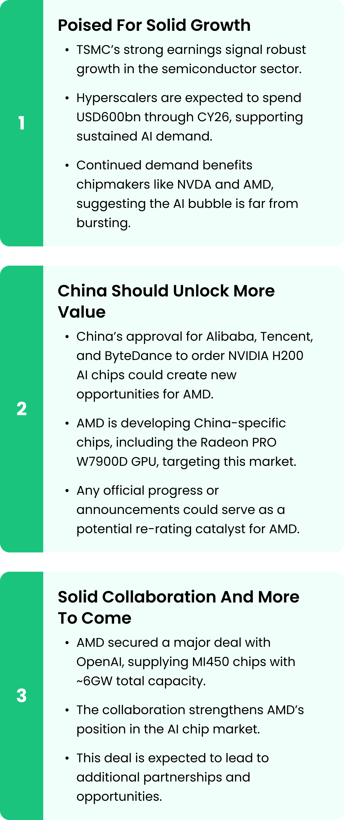Stock Pick (US) - Advanced Micro Devices - Remains Overlooked in AI Play Stock Pick (US) - Advanced Micro Devices - Remains Overlooked in AI Play M+ Research January 26, 2026 1 min read Share on X/Twitter Share on Facebook Share on LinkedIn Share on Pinterest Email Copy Link On this page BUY NOWAMD operates through its four segment: Data Centre, Client, Gaming as well as Embedded.BUY NOW