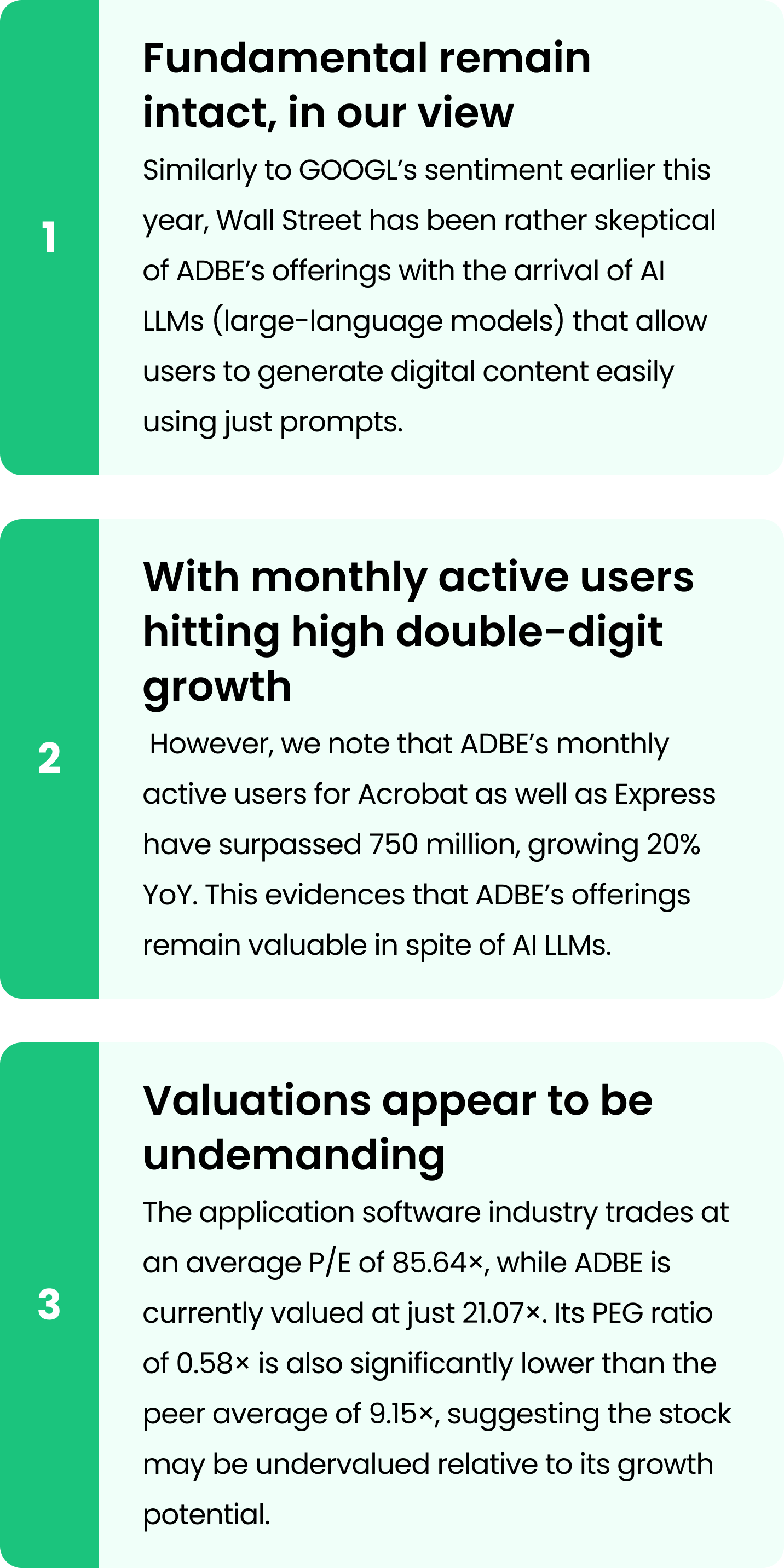 ADBE delivers creative, document, and customer-experience software through Creative Cloud, Document Cloud, and its Digital Experience platform. It serves creators, enterprises, and consumers worldwide, distributed via online channels and partnerships.